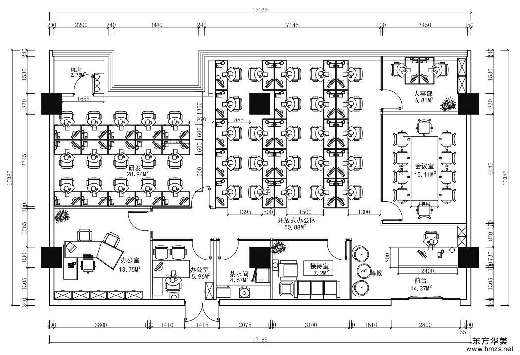 ▄原建筑結(jié)構(gòu)分析: 總經(jīng)理辦公室、財(cái)務(wù)室和一些特別的會議室外,建議采用全通透或者半通透的隔斷,這樣可以增加企業(yè)融合力和方便交流,也便于員工互相監(jiān)督。在裝修設(shè)計(jì)中要突出重點(diǎn)區(qū)域,抓住幾個(gè)關(guān)鍵點(diǎn),例如前臺、會議室、總經(jīng)理辦公室等空間。要盡可能少地采取大的裝修結(jié)構(gòu)和造型,多用燈光和色彩以及現(xiàn)代化的配飾組合取得良好的裝飾效果。